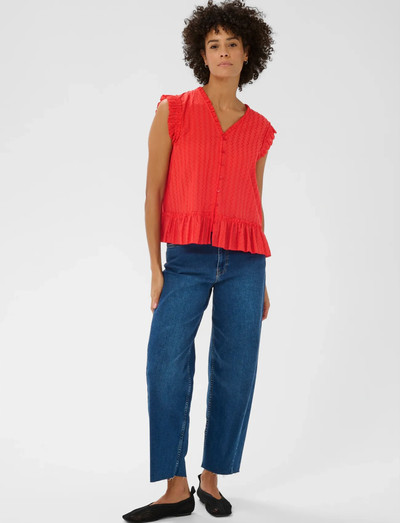 Volangid ja nööbitav esiosa iseloomustavad seda varrukateta pluusi. Kerge kangas ja V-kaelus lisavad sellele õhulise ja mugava tunde, muutes selle ideaalseks soojaks ilmaks.