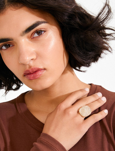 Tee avaldus sõrmusega, mis on täis puhast sära ja kompromissitut isikupära. Kullatud sõrmusel on julge, ruudukujuline keskosa, millel on ainulaadne laineline pind, mis on kaunistatud sädelevate Preciosa kristallidega. Selle reguleeritav suurus muudab selle kandmise lihtsaks, sobib suurepäraselt nii igapäevaseks glamuuriks kui ka pidulikeks hetkedeks. Valmistatud 88% ulatuses taaskasutatud materjalidest.