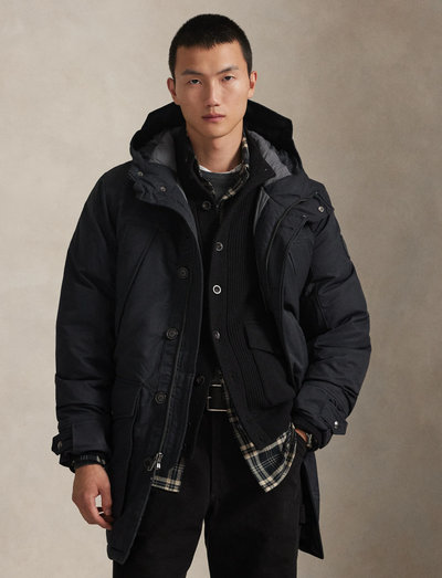 Blending a heritage sensibility with functional design, this versatile coat is ready to protect from chilly and rainy weather, thanks to 650-fill-power down fill and water-repellent twill. Drawstrings at the hood and waist provide a customizable fit, while grommets at the underarms allow for breathability. Considered finishings like tonal and leather trim as well as a signature shield patch imbue this layer with iconic Polo style.Size medium has a 36.5" front body length, a 36" back body length, a 19" shoulder, a 49.5" chest, and a 36.5" sleeve length. Sleeve length is taken from the center back of the neck.Drawstring hood with a built-in brim. Two snaps at the collar. Two-way full-zip front with a buttoned placket. Leather zipper pull. Long sleeves. Adjustable snapped tabs at the cuffs. Ventilating metal grommets at the underarms.Two chest angled pockets with concealed snaps. Two front pockets with buttoned flaps and snapped side entries. Two interior chest pockets. Interior left waist pocket. Interior drawstring at the waist. Fully lined and filled.