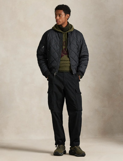 An update to the classic bomber jacket, this quilted version is crafted with water-repellent jacquard and filled with down-alternative insulation. It is finished at the left sleeve with a silicone iteration of our signature shield patch for iconic Polo style.Size medium has a 26.5" front body length, a 25.75" back body length, a 20.5" shoulder, a 52" chest, and a 36" sleeve length. Sleeve length is taken from the center back of the neck.Ribbed baseball collar. Two-way full-zip front. Zipper pulls custom-developed with a “Polo” logo.Long sleeves with ribbed cuffs. Zip pocket at the right sleeve.