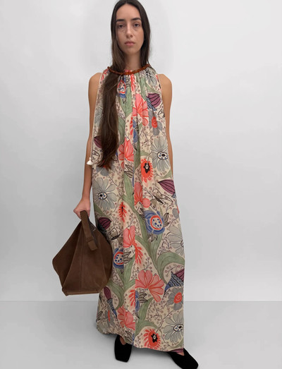 See maksikleit on langeva siluetiga ja halterkaelusega, millel on õrnad lipsudetailid. Üldine lillemuster lisab elegantsi, muutes selle ideaalseks soojadeks suvepäevadeks.