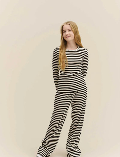 Nendel pikkadel pükstel on mugav nööriga vöökoht ja lõdvestunud lõige. Triibuline disain lisab igale riietusele mängulise puudutuse, muutes need mitmekülgseks valikuks igapäevaseks kandmiseks.