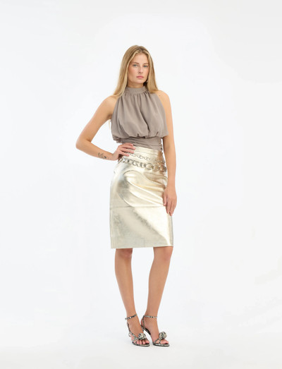 See kõrge kaelusega varrukateta top on kroogitud pihaga, mis loob meeldiva silueti. Pehme kangas langeb kaunilt, muutes selle ideaalseks nii päeval kui ka õhtul kandmiseks.
