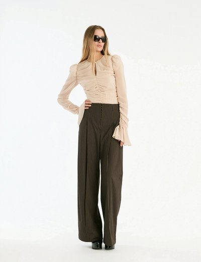 Klassikaline triibuline muster rõhutab neid laia säärega pükse. Disainil on kõrge vöökoht ja eest nööbitav kinnitus.