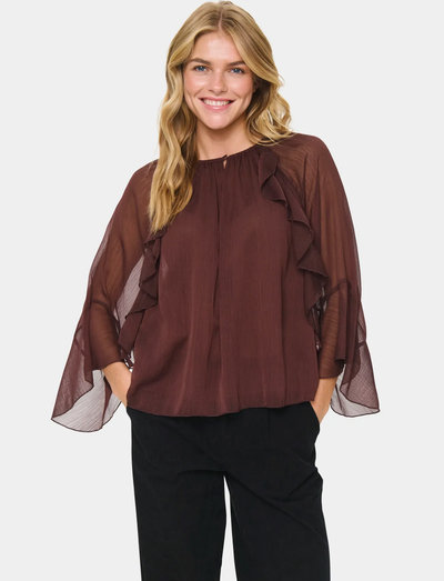 Õrnad volangid langevad alla selle kerge pluusi esiosal, lisades romantilise puudutuse. Pikad varrukad lõppevad peene lehvikuga, luues voolava silueti.