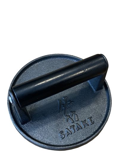 Puidust käepidemega burgeripress. Valmistatud malmist.