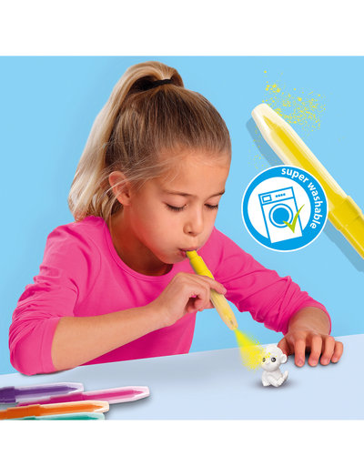 Contents: 6 x safari animals, 5 x blow pens (turquoise, yellow, orange, purple, pink) , 1 x black marker, 1 x sponge.