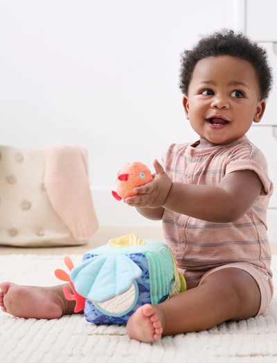 Set off on an ocean filled with treasure and play! Skip Hop's ocean-inspired soft activity cube is filled with exciting textures, rattles and surprises to spark your baby's curiosity and encourage sensory exploration. The cube features a hide-and-seek pufferfish that rattles, a rustling seashell with a hidden mirror, a ribbed fish teether, soft corals and many more treasures to discover.