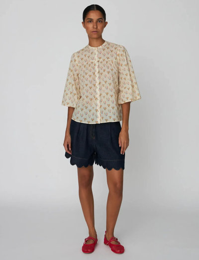 See kergest puuvillast särk on kaunistatud õrna üldmustriga. Disainil on eest nööbitav esiosa ja kolmveerandpikkusega varrukad, mis teeb sellest mitmekülgse täienduse igale garderoobile.