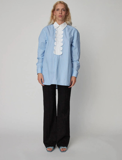 Klassikaline triibuline muster iseloomustab seda pikkade varrukatega särki, mida täiustab kontrastne krae. Kammkarbi detailid kaunistavad esiliistu, lisades sellele nööbitavale stiilile mängulist elegantsi. Varrukad on viimistletud mansettidega.