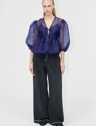 Õrnad laserlõigatud lillelised detailid kaunistavad seda läbikumavat organzast pluusi. Disainil on V-kaelus ja võluv esiküljel seotav lips. Pluus on viimistletud 3/4 puhvvarrukatega, millel on elastsed mansetid, ning sellel on pehme sisevooder, mis tagab mugavuse.