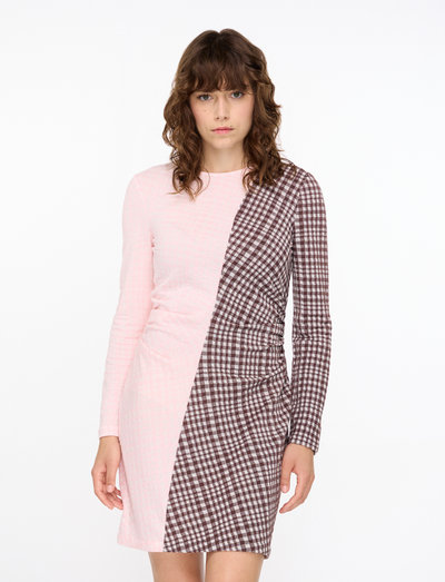 See lühike kleit on valmistatud seersucker-trikotaažkangast ning sellel on pikad varrukad ja meelitav, pehmelt kroogitud vöökoht. Ruuduline muster lisab sellele mugavale ja stiilsele rõivale visuaalset huvi.