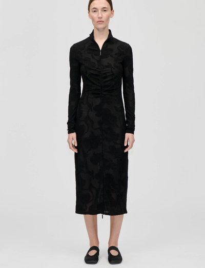 Elegantne pikkade varrukatega ja eest lukuga lõhikuga kleit, millel on meelitavad krookedetailid ja veerandpikkuses lukuga kõrge kaelus. Valmistatud kergest taaskasutatud polüestri segust.