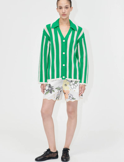 See triibuline heegeldatud kampsun on lõdvestunud ja ülemõõduline. Seda on täiendatud V-kaeluse, klassikalise krae, eest nööbitava esiosa ja õrnade kammkantidega.