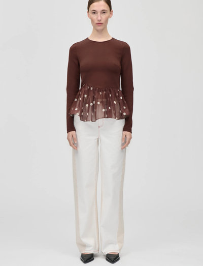 Pehme jersey-kangasest pikkade varrukatega pluus, mille asümmeetriline alläär on kaunistatud täpilise läbipaistva organza-peplumiga.