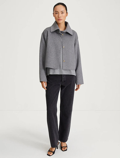 See kärbitud jakk on valmistatud kahepoolsest villasegust ning sellel on peenelt laienev siluett. Disainis on kasutatud signatuurset seljaosa passe voldiga, täispikad laiad varrukad ja struktureeritud krae püstkrael. Esiküljel on peidetud nööbiliist kolme nööbiga ja üks nööp krae juures.