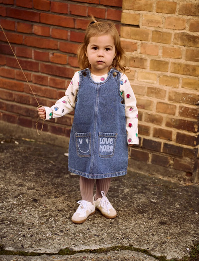 This denim dress from THE NEW siblings is both fun and practical. The dress features a classic A-line fit with two large front pockets, decorated with a smiling face and the text "Love More." It has button closures on the shoulders, making it easy to put on and take off. The durable denim quality makes the dress ideal for play and everyday wear, while also being suitable for festive occasions. Perfect to pair with a T-shirt or a long-sleeved top underneath. - A-line fit - Front pockets with playful prints - Sleveless- Button details on the shoulders - Durable and sturdy denim quality