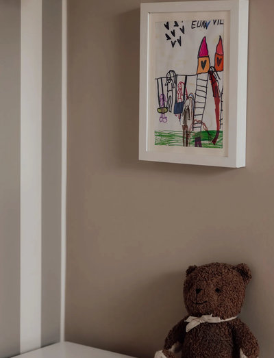 This gallery frame from Vanilla Copenhagen is perfect for framing your children's drawings and paintings. The frame can hold up to 80 drawings in A4 format. It has a magnetic closure in the front, making it easy to insert the drawings. The drawings that are not displayed can be stored behind the frame using two elastic bands. The frame has two hanging hooks on the back, so it can be hung both horizontally and vertically. The frame is made of MDF wood and has an acrylic panel that does not splinter like glass, making it suitable for a child's room. Dimensions: 24.3 x 33.3 x 4 cm.