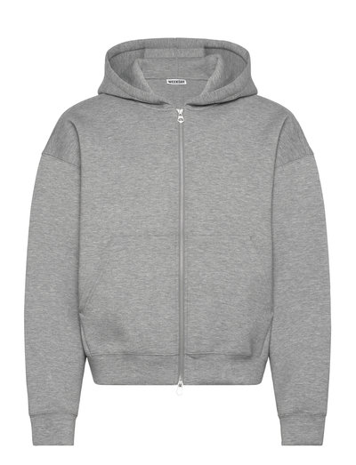 A regular fit zip hoodie made from a chunky scuba fabric with a recycled polyester and viscose blend, enhanced with a touch of recycled elastane. It has slightly dropped shoulders, ribbed cuffs and hemline, and a sturdy two-way front zipper.