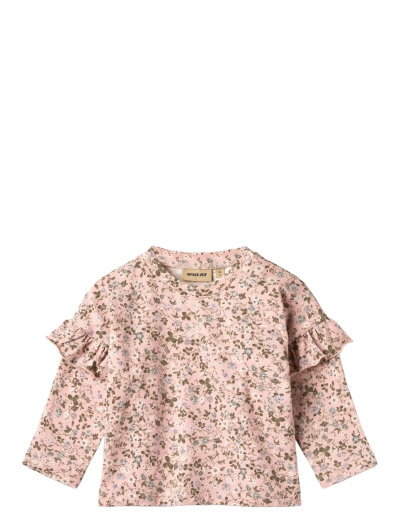 Long-sleeved T-shirt with print in soft organic cotton for your baby. - Loose fitted- Ruffle at sleeves- Dropped shoulders- Press buttons on left shoulder- Wheat signature printWheat's T-shirts are a true essential in your babys wardrobe, as the T-shirts are soft and comfortable for your child to wear. They can easily be styled with pair of trousers or leggings, or with a knit on top depending on the weather and occasion. It is also perfect as an extra layer underneath a dress or overalls on colder days. ---- Standard 100 by OEKO-TEX® - 95% Organic cotton, 5% Elastane- The product is GOTS certified
