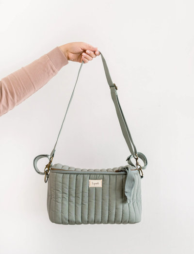 Smart quilted stroller organizer with a shoulder strap that allows it to be converted into a compact diaper bag.