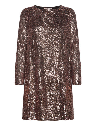Alexi dress is a mini dress with sequins. The dress has a loose fit and long loose sleeves. The dress has a petticoat and a boat neckline.