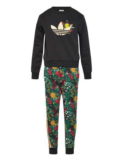 A comfortable set featuring a floral-print bottom and a top with a floral logo, perfect for everyday wear. The pants have a sporty stripe down the side, adding a touch of athletic style.