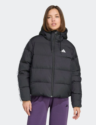 Brave the cold in this insulated jacket, designed to keep you warm during outdoor activities. Featuring wider baffles and enhanced down filling, it maximizes heat retention. The adjustable hood provides extra protection against wind and cold. Its loose fit makes layering easy, while CLIMAWARM technology traps heat and wicks away sweat, ensuring a dry and comfortable experience. The iconic three stripes adorn the sleeves.