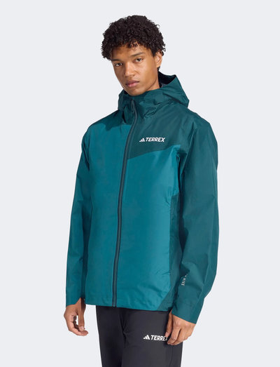 Hike. Explore. Travel. This adidas Terrex rain jacket offers waterproof breathable coverage that packs down small for easy stowing in a pack or bag. RAIN.RDY seals out water to keep you dry through showers and wet weather. The lightweight 2.5-layer design maintains breathability that lets your body regulate its temperature as you heat up while hiking. Layer it over a fleece or hoodie in cool weather or throw it on over a shirt when afternoon showers try to slow you down. When the sun shines, pack it into its built-in storage pocket and keep exploring.