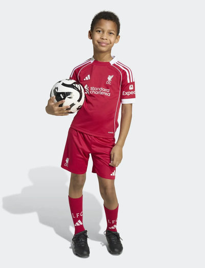 Welcome home, Reds. Liverpool FC and adidas have always been the perfect team. Kicking off their third spell together, the club's 25/26 home kit brings some real mid-'00s football vibes with a clean, crisp look and white piping on the shirt. Sized for kids, this version includes a jersey and shorts. Moisture-managing AEROREADY will keep them comfy in the colours they'll love for the rest of their lives. • Regular fit • Crewneck • 100% polyester (recycled) • AEROREADY • Shorts with elastic waist • Liverpool FC woven crests