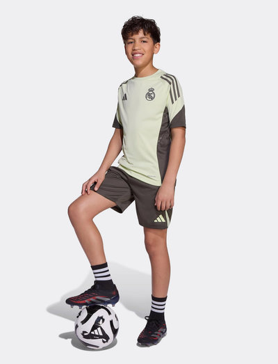 Bring your Real Madrid passion to the training ground. Part of the adidas kit the players wear before tackling league games, these juniors' football shorts team moisture-managing AEROREADY with soft interlock fabric for comfortable movement on the field. A heat-applied badge shares your fandom without adding much weight. • Regular fit • Elastic waist with drawcord • 100% polyester (recycled) • AEROREADY • Side pockets • Real Madrid heat-applied crest