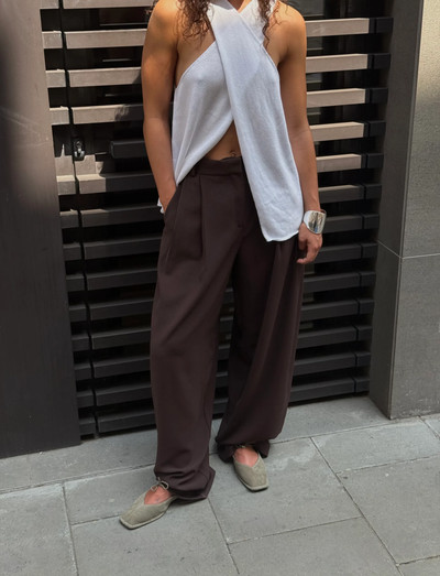 The Sway ballet flats, a timeless classic, have been updated this season with a refined coffee brown suede finish. Featuring a square toe and distinctive V-shaped vamps, they are secured with a bow across the instep. This refreshed design provides a versatile touch to any ensemble.