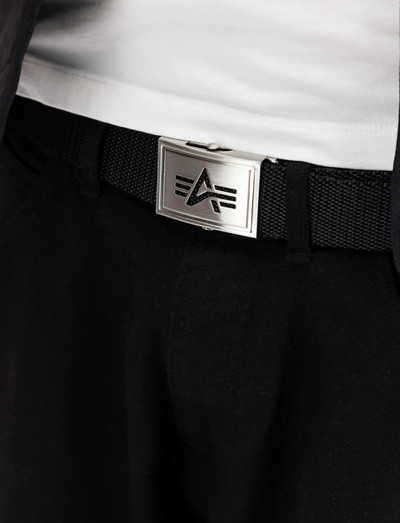 Featuring a robust construction, this belt is designed for long-lasting wear. It's finished with a distinctive metal buckle, showcasing a cut-out logo.