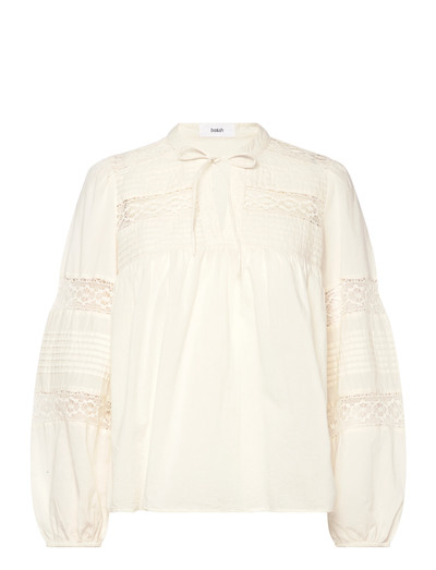 Featuring delicate lace inserts, this long-sleeved blouse offers a touch of refined elegance. The design incorporates a subtle tie detail at the neckline and gently puffed sleeves, creating a soft, feminine silhouette.