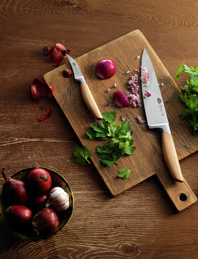 The BALLARINI Tevere larding and garnishing knife is ideal for all delicate and careful kitchen work. This makes the small kitchen knife somewhat of a sophisticate among knives. The larding knife, also known as a garnishing knife has a blade length of 9 cm. It is an all-purpose knife for fruit and vegetables and its sharp point makes it ideal for larding. Excellent for peeling, trimming, cutting and garnishing. And the small kitchen knife is also wonderful for chopping delicate herbs. Thanks to its ergonomically designed wooden handle, the larding knife sits excellently in the hand. The knife is made with German stainless steel and is especially corrosion-resistant. Do you have to prepare a lot of vegetables for your pasta al Verdure? Senza probleme, thanks to this elegant, premium larding and garnishing knife. Onions, courgettes, aubergines and tomatoes are prepared correctly in moments. All that remains to do is to chop some fresh basil and invite some friends over. Ergonomically designed handle for effortless use Sophisticated design Incredible sharpness and cutting-edge retention Very good corrosion resistance Finger guard for greater safety Made with German stainless steel Made from German Stainless Steel Warranty: ZWILLING Lifetime Warranty