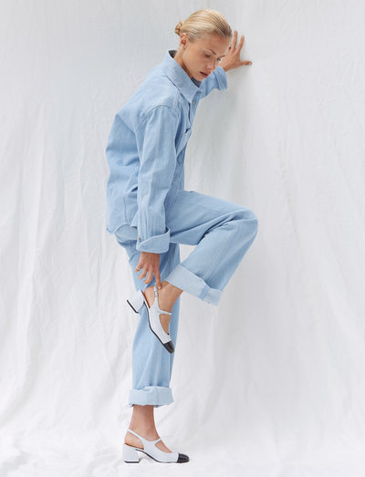 Handcrafted slingback pump in Mary Jane look with cap toe on block heel