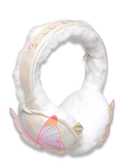 Earmuffs iridescent and faux-fur. Fancy illustration "Butterfly" clear iridescent PVC. Branded embroidery. Stripe woven label.