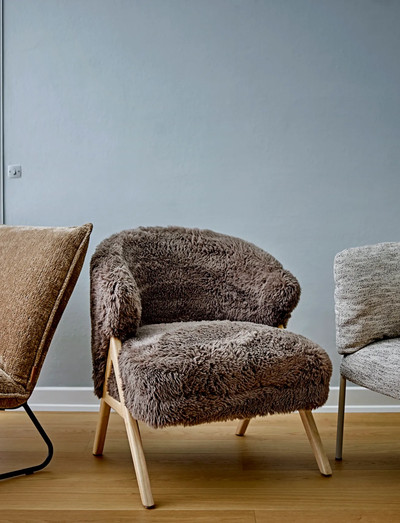 The Camino Lounge Chair by Bloomingville is a seating design crafted from rubberwood with a lacquered finish, It features a wide seat and rounded back in soft faux fur fabric, The angled frame creates a modern look, while light legs complete the look in a soft, muted tone,