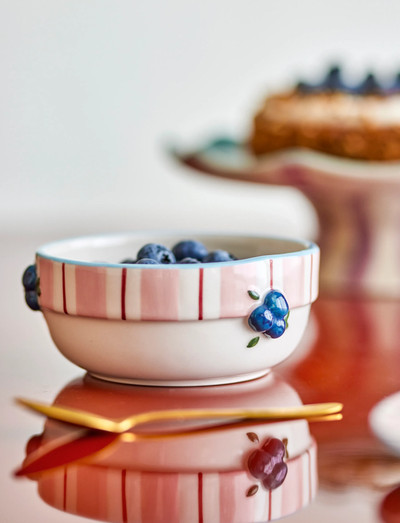 The Carry Bowl by Bloomingville is a set of four stoneware bowls with a rose-toned surface, soft vertical stripes, and contrasting floral details, Featuring an embossed, handpainted finish, each piece has a tactile texture, Small variations in pattern and color intensity may occur, making each piece unique,