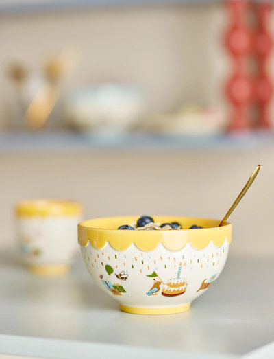 The Celebrate Bowl by Bloomingville MINI is made of stoneware and features cheerful illustrations in soft tones. The yellow interior adds warmth and vibrancy to the table.