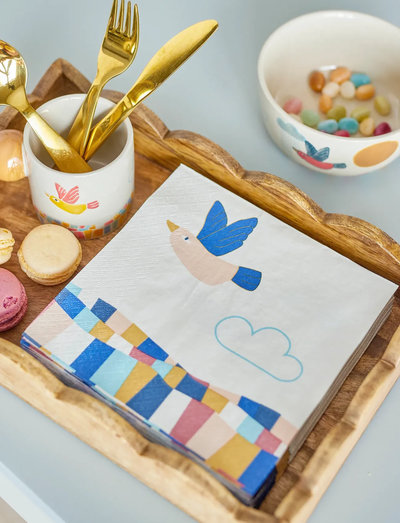 The Colorine Napkins by Bloomingville MINI come in a pack of 20 and are made of FSC-certified paper. They feature a serene motif of a bird flying over a peaceful landscape – perfect for a cozy children's party.