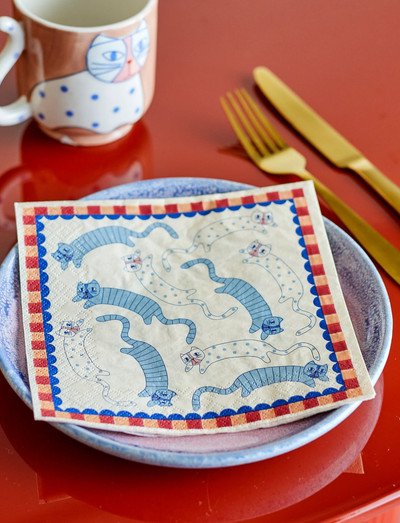 The Missy Napkin by Bloomingville comes in a pack of 20 and is made of paper in FSC® mix, The napkin features a colourful cat motif and the cheerful phrase “Don’t stress meowt”, adding a playful, humorous touch to the table setting, Ideal for cosy gatherings with a lighthearted mood,