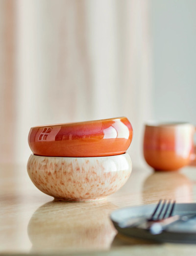 The Roselyn Bowl by Bloomingville is a set of four stoneware bowls with a reactive glaze in soft rose, Each bowl features a gently rounded shape with a tapered rim and a mix of smooth and speckled finishes, Small variations in pattern and color intensity may occur, making each piece unique,