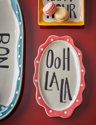 The Soline Serving Plate by Bloomingville is crafted in stoneware with a handpainted design in beige, featuring soft rose and black accents and a bold "Ooh La La" at the center, A scalloped rim with white dots completes the look, Small variations in pattern and color intensity may occur, making each piece unique,