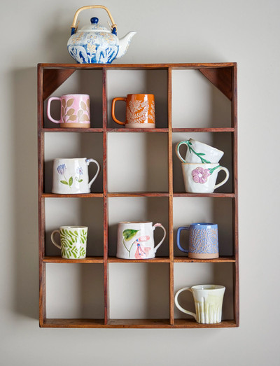 The Tilo Shelf by Creative Collection is a wooden shelving unit with a waxed finish that enhances its surface, Designed with twelve equal cubbies and slim bars in a warm brown tone, it features sharp angles and a clean layout, The product is made of natural materials – variations in color may occur, making each piece unique,