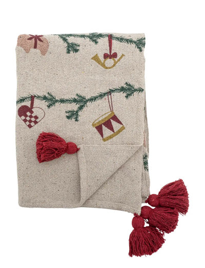 The Yule Throw by Bloomingville is woven from recycled cotton and adorned with a cozy printed pattern of hearts, fir branches, and classic Christmas motifs, perfect for the festively decorated home. The blanket features soft red tassels at each corner and will create a cozy and warm atmosphere in any room.