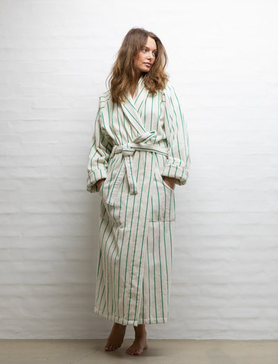 Give yourself a soft hug with the luxurious naram bathrobe. the bathrobe has a generous fit and provides great coverage perfect for when you get out of the sea, pool or shower. the naram bathrobe has a classic, but modern design with vibrant colours and stripes. the bathrobe comes with a shawl collar, open front, belt closure and two spacious pockets making it perfect for relaxed mornings or just cosying up on the sofa. the naram bathrobe is oekotex® certified and made from 100% combed cotton woven in a 385gsm quality which provides great absorbency. the special combing technique polishes the cotton fibres, so that they achieve shine and a silky feel with each use. available in two sizes: s/m and l/xl. measurements from the back of the neck to the bottom seam: s/m = 122 cm and l/xl = 138 cm . if you are taller than 176 cm or prefer an oversize look, we recommend that you choose a size l/xl.