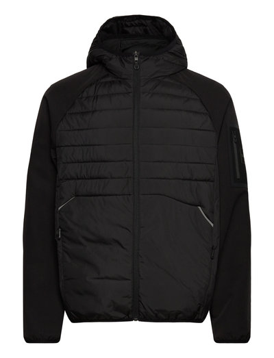 URBANEX hybrid jacket / for transseasonal temperatures / high-tech filling at front body / long lasting body material with water-repellent finish to protect against light rain / sleeves and body back in soft stretch TechLite-fabric / center front zipper closure / side pockets with zips for secure storage of personal belongings / rubber logo print on chest / reflective details on front and backside for better visibility outdoors / elasticated hood, hem and cuffs for a more adherent fit / iconic zip pocket on left sleeve