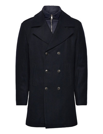 Double breasted coat in wool and polyester blend. Removable nylon vest with zipper inside for cold days. Wide lapel width and horn button as closure. Belt strap details on shoulder with horn buttons. Front waistpockets and one inside chest pocket.