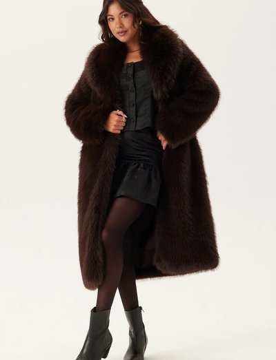 Long faux fur jacket by BUBBLEROOM- Straight fit- Button closure at the front with snap buttons- Pockets on the side- Lined- Length from shoulder: 115 cm in size S